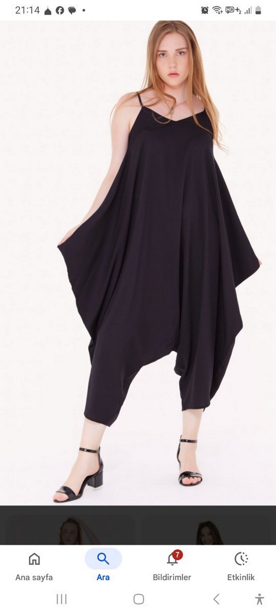 Siyah, salaş kesim uzun tulum; drapeli, straplez yaka ve kolsuz tasarıma sahiptir. İpeksi kumaştan yapılmış, çağdaş avant-garde stil sunar.