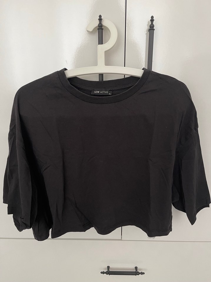 Siyah kısa kollu, yuvarlak yaka ve bol kesim crop top. Yumuşak sentetik kumaştan, günlük kullanıma uygun, zahmetsiz şıklık sunar.