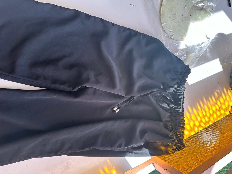Siyah, salaş kesim kadın pantolon, normal midi boyda ve drapeli tasarıma sahip, sokak modası ve dış mekan spor giyime uygun.
