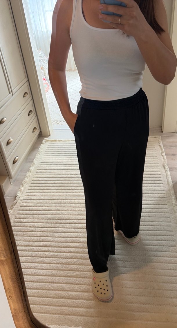 Siyah, salaş kesim, ipeksi dokulu kadın kumaş pantolon, midi boyda ve normcore tarzıyla günlük kullanıma uygun.