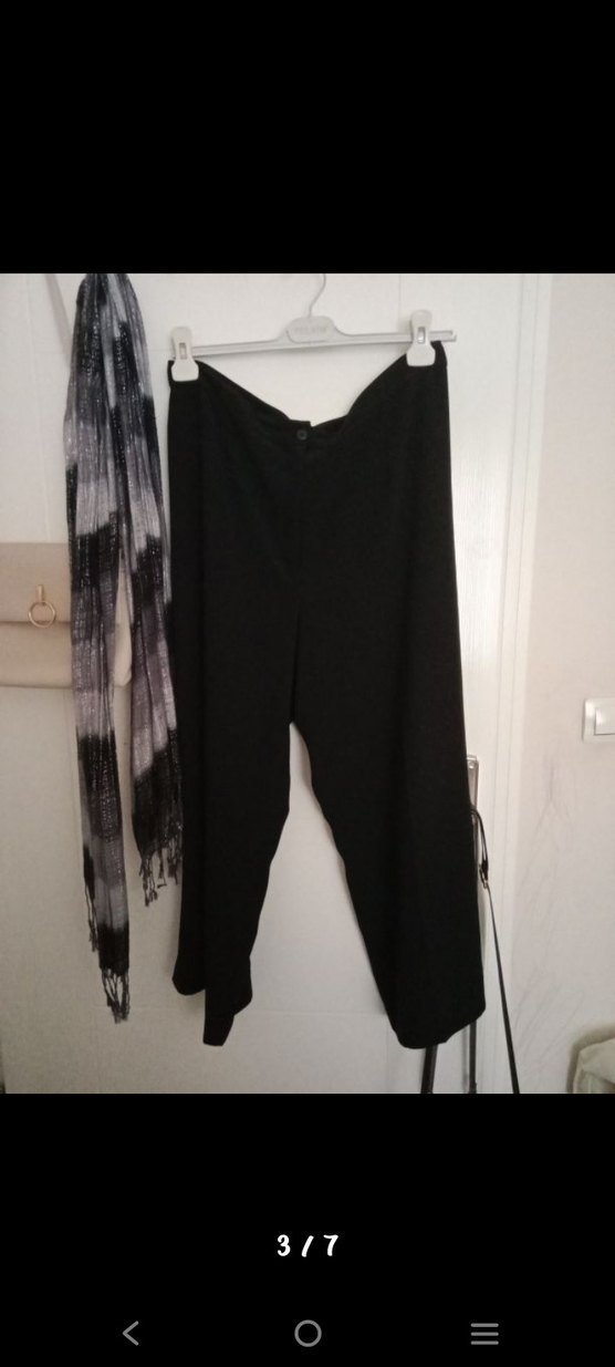 Uzun, salaş kesim siyah pantolon, dökümlü krep kumaştan üretilmiştir.