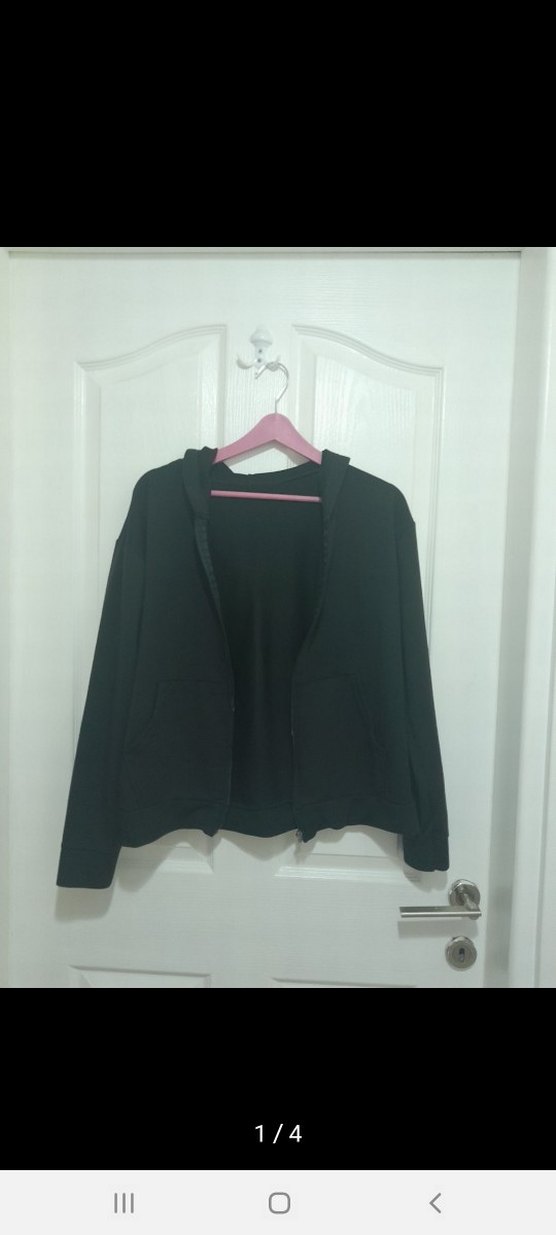 Siyah, salaş kesim kadın midi boy sweatshirt, uzun kollu ve kapuşon detayına sahiptir. Fermuar kopçası kırıktır kapatmaya engel değildir