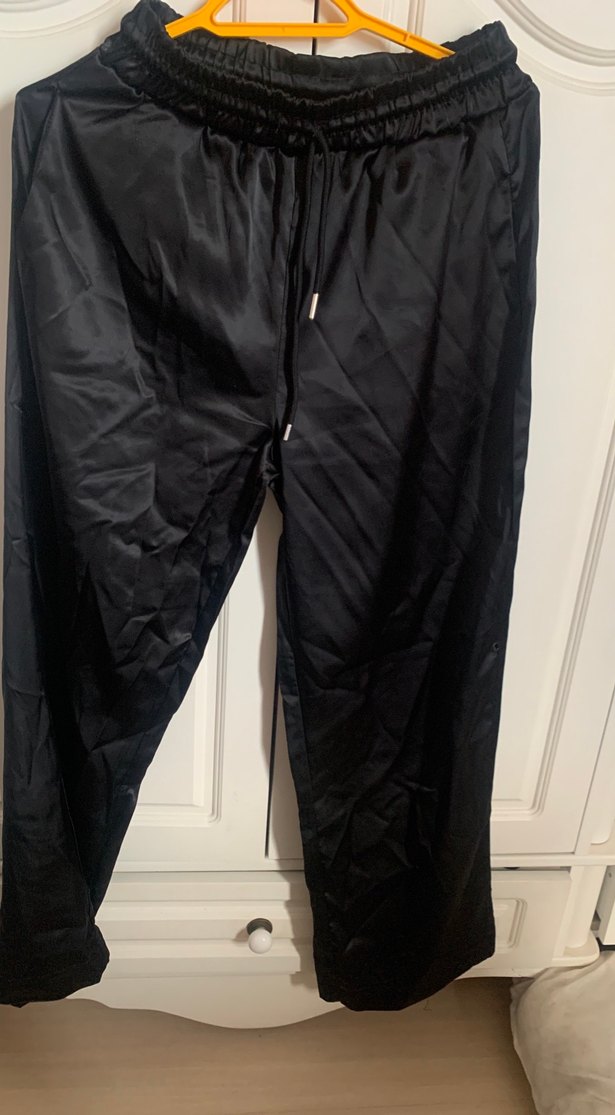 Siyah midi uzunlukta, salaş kesim kadın pantolon, ipeksi kumaş ve drapeli tasarıma sahiptir. Sokak stiline uygun, günlük kullanım için ideal.