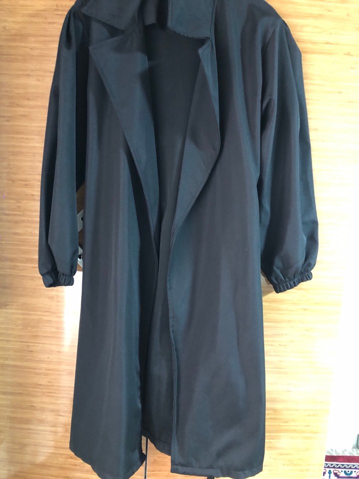 Siyah, salaş kesim, uzun kollu, ipeksi dokulu kadın kaban. Notch yakalı ve dökümlü tasarımı ile , minimalist stil.