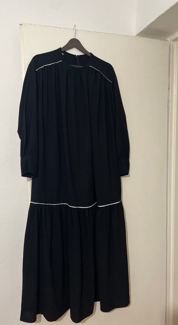 Siyah, salaş kesim ve drapeli uzun elbise. Yüksek yakalı ve askılı kollu, minimalist ve sade tarz için uygun. Seyyar kemeri var