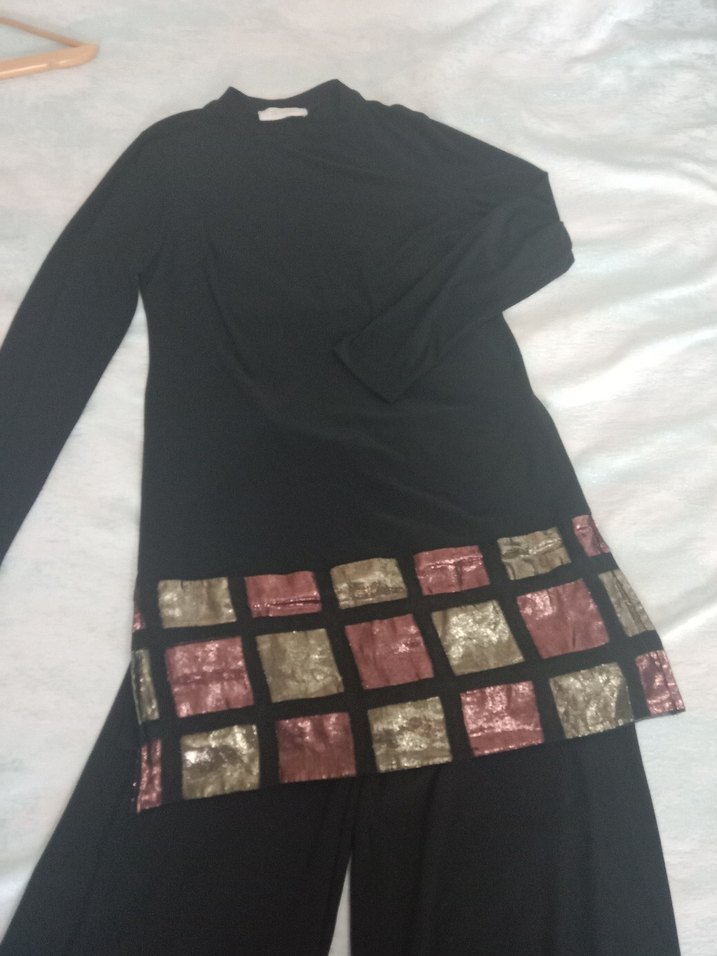 Siyah, sentetik kumaştan uzun ve salaş kesim kadın pantolon, drapeli tasarıma sahip. Uzun kollu, boğazlı üst renkli patch detaylarla tamamlanmıştır.