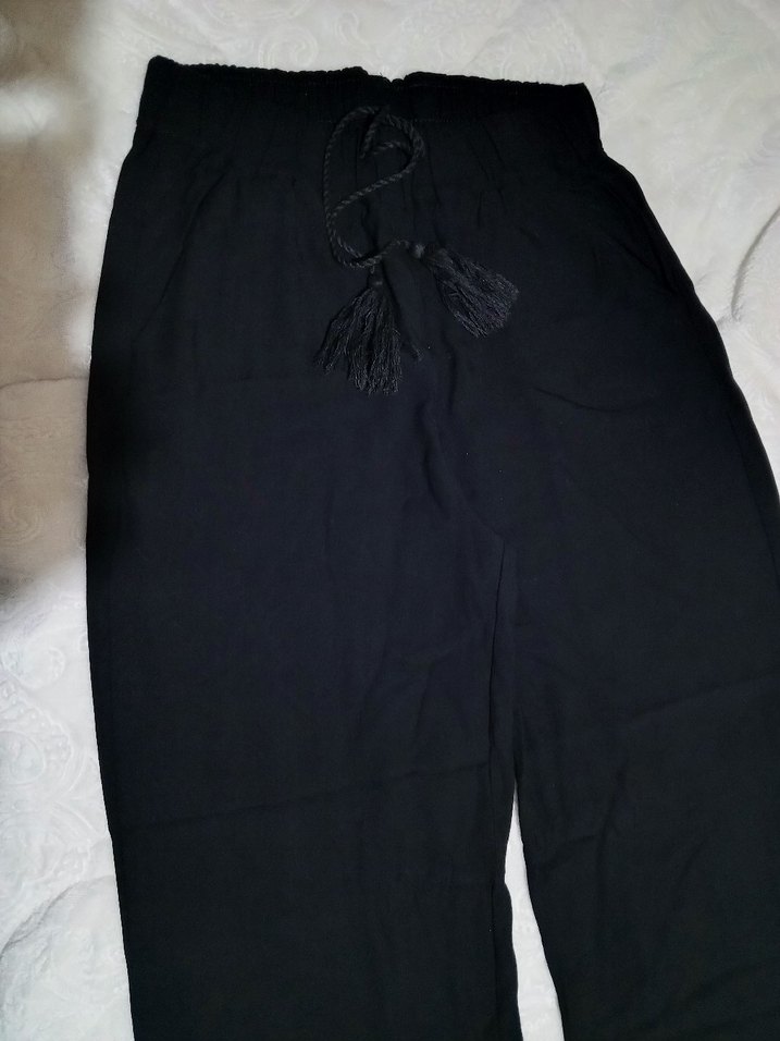 Siyah, salaş kesim, ipeksi kumaştan kadın pantolon, püsküllü detaylı ve uzun boy, günlük rahat kullanım için uygundur.
