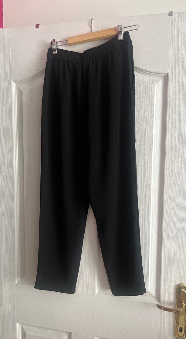 Siyah, salaş kesim ve midi boy kadın kumaş pantolon, ipeksi dokusuyla rahat ve şık bir görünüm sunar. Günlük kullanıma uygundur.