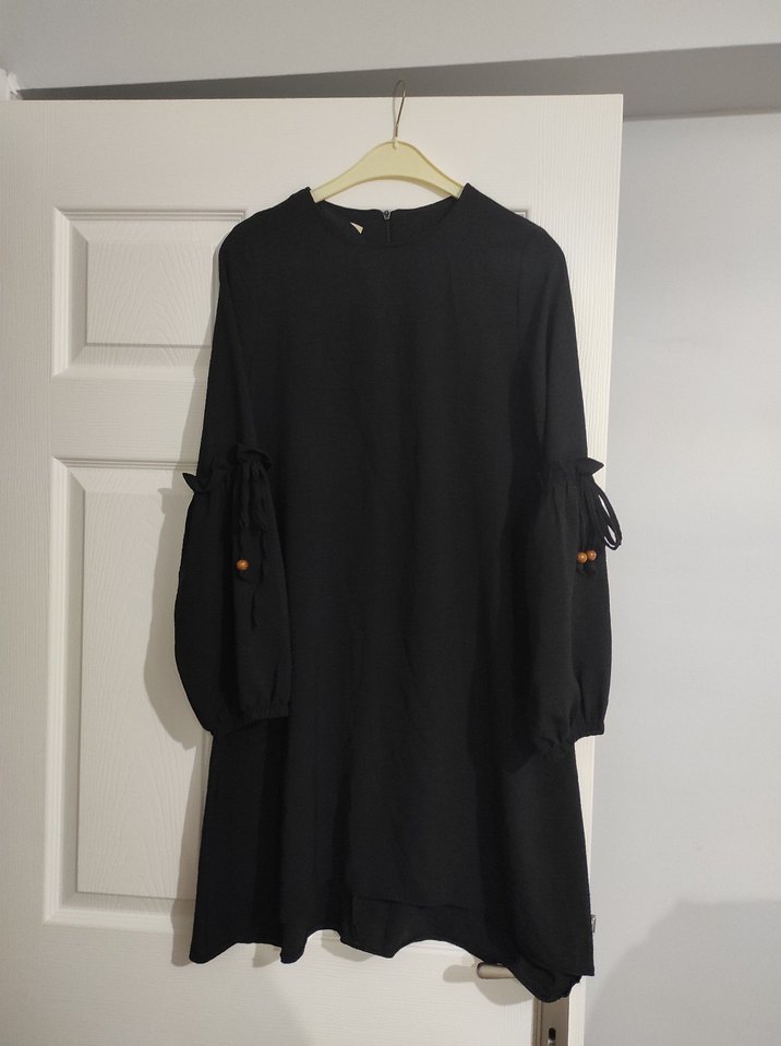 Salaş kesim siyah keten tunik, uzun kollu, yuvarlak yaka ve kollarda püskül detaylı. Günlük kullanıma uygun, minimalist tarzda.
