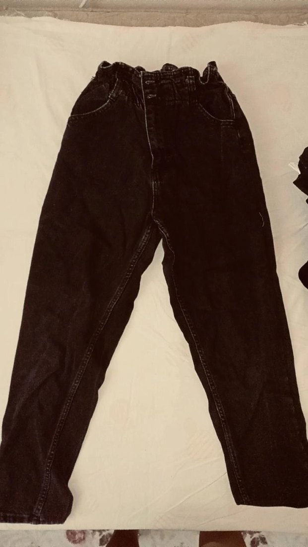 Siyah, salaş kesim midi kot pantolon. Denim kumaştan, gündelik kullanıma uygun rahat ve şık bir model.