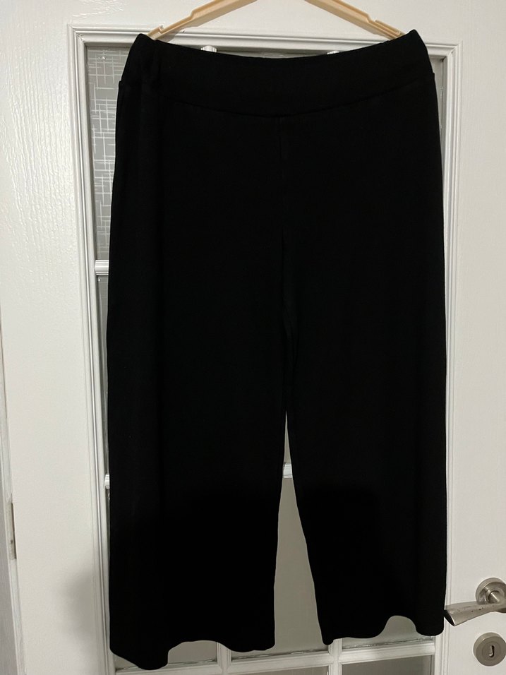 Siyah, salaş kesim midi boy, ipeksi kumaştan yapılmış desensiz pantolon. Ofis için uygun, rahat ve şık bir stil sunar.
