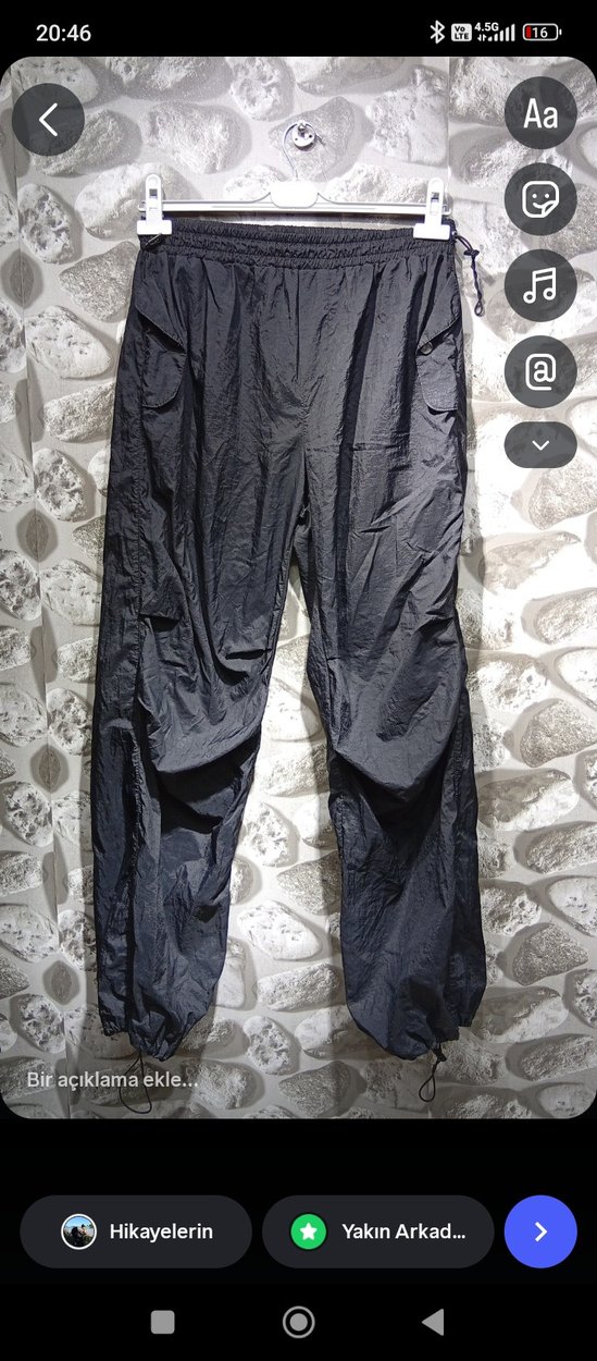 Salaş kesim, siyah paraşüt n pantolon, drapeli tasarım ve midi boyda. Sokak stiline uygun, dış mekan için ideal.