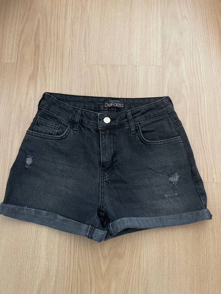 Siyah salaş mini denim şort, kıvrık paça ve hafif yırtık detaylara sahip, rahat sokak stili için uygun.