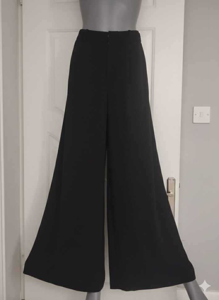 Uzun, salaş kesim siyah pantolon, dökümlü tasarımı ve ipeksi dokusuyla minimalist ve şık bir ofis görünümü sunar.