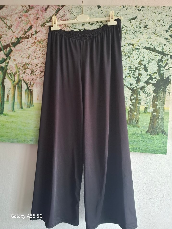 Siyah, ipeksi kumaştan yapılmış, salaş kesim ve drapeli uzun kadın pantolonu, gündelik kullanımı için uygun.