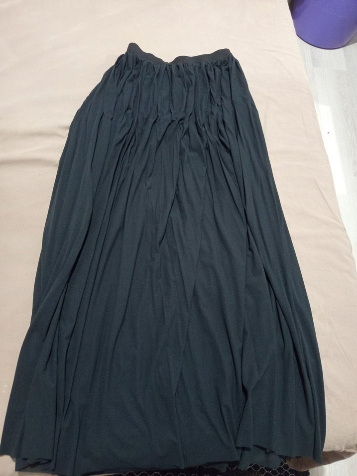 Siyah, keten kumaştan yapılmış, salaş ve drapeli uzun etek. Minimalist bohem tarzıyla günlük kullanıma uygundur.