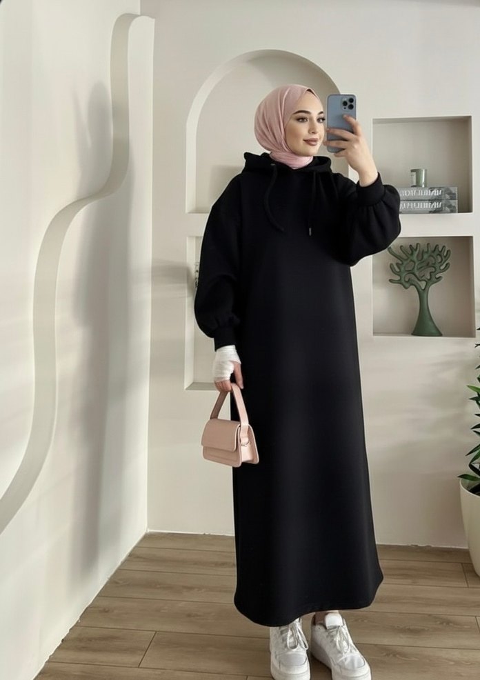 Siyah uzun elbise, yüksek yakalı ve uzun kolludur. Rahat kesimi ve sentetik kumaşıyla kolay şıklık sunar. Günlük sokak stiline uygundur.