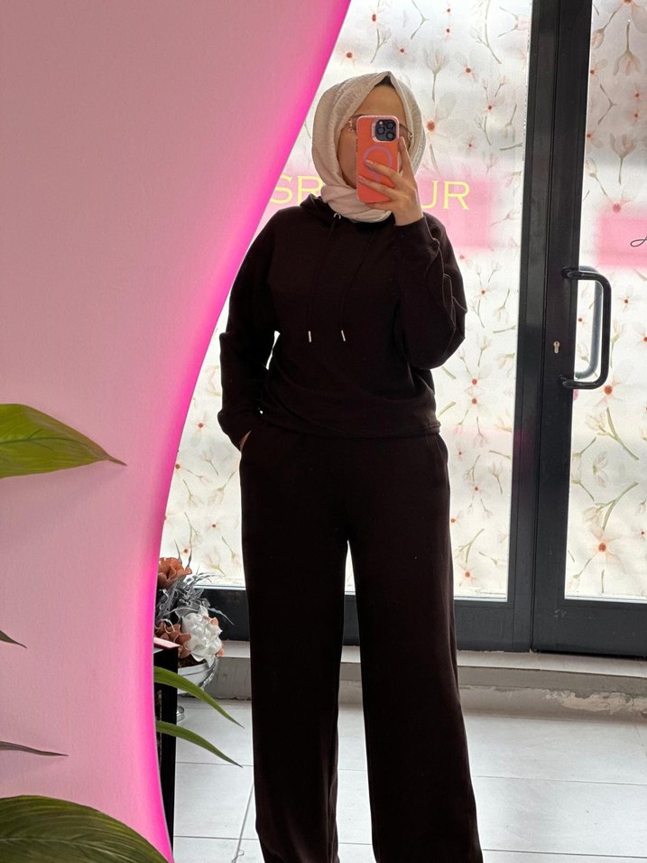 Siyah renk, salaş kesim ve uzun boylu bu kadın takımı yüksek yakalı ve uzun kolludur. Yumuşak ve sıcak kumaştan, bağlama deseniyle günlük rahat kullanım için uygundur.