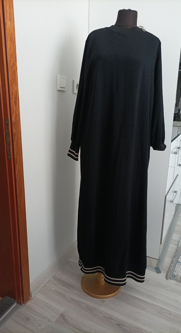 Salaş kesim, uzun kollu, bisiklet yaka siyah elbise. Drapeli detaylar ve çizgili manşet ile etek ucu bulunur. Sentetik kumaştan günlük kullanım için uygundur.