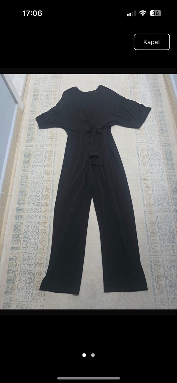 Siyah, salaş kesim midi tulum, drapeli ve yuvarlak yakalıdır. İpeksi kumaştan üretilmiş, askılı kollara sahiptir ve minimalist tarzda uygundur. Önden bağlamalı düz siyah midi boy tulum