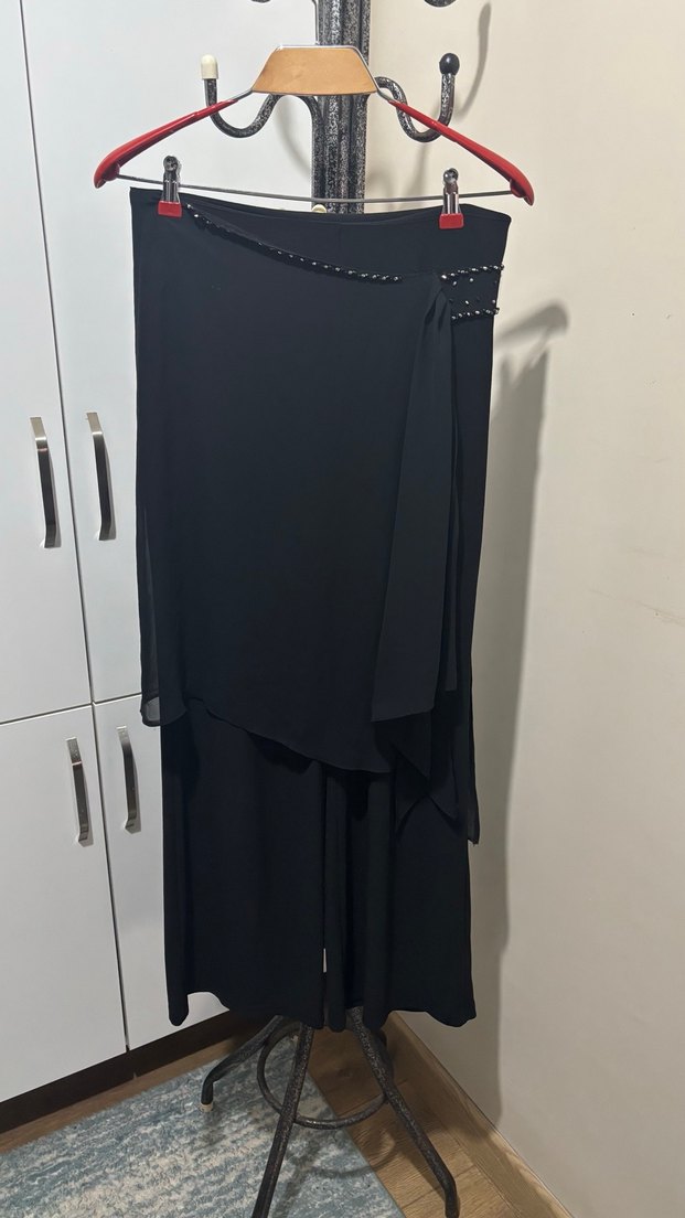 Siyah uzun, salaş kesim ve drapeli detaylara sahip etek. Sentetik kumaştan, gotik stile uygun, ofis için ideal.