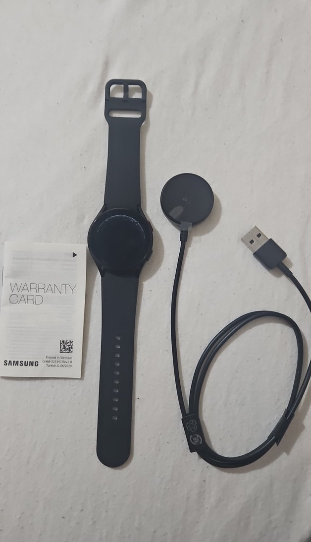 Siyah Samsung akıllı saat, şarj kablosu ve garanti kartıyla birlikte gelir. Şık tasarıma ve rahat kayışa sahiptir. ⌚Hiç kullanılmadı 1 Siyah Samsung akıllı saat, şarj kablosu, hızlı başlangıç kılavuzu ve garanti kartı ile birlikte. Koyu renkli, şık tasarıma sahip. garantisi kaldı. gayet hızlı aşırı begeniliyor