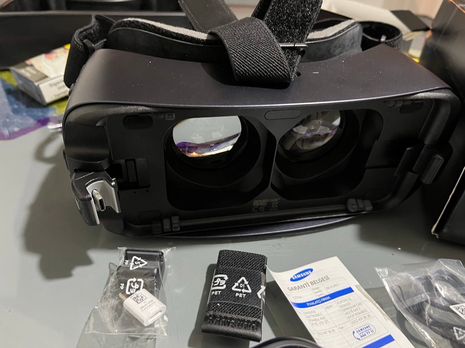 Ayarlanabilir kayışlı siyah Samsung VR gözlüğü, lensler, USB adaptörü ve garanti belgesi ile birlikte gelir.