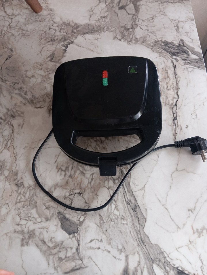 Gösterge ışıklı, kompakt tasarımlı siyah sandviç ve tost makinesi. Güvenli kullanım için tutma sapı ve güç kablosu bulunur.