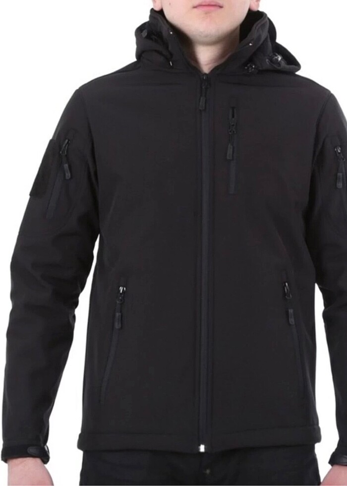 Softshell Siyah Şapkalı Su Geçirmez Taktik Mont