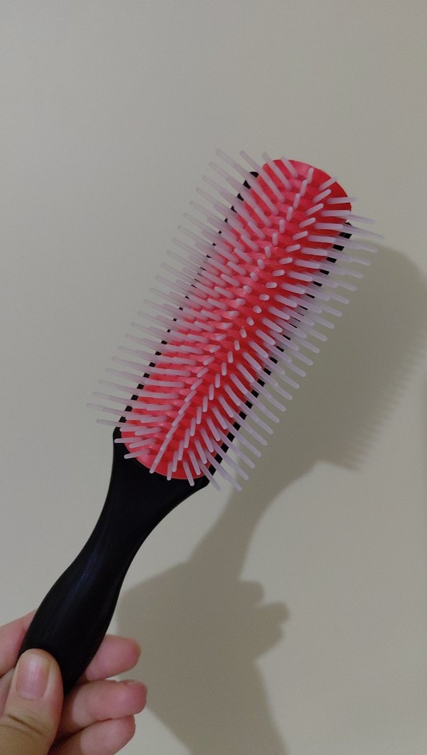 Siyah saplı ve kırmızı tabanlı, beyaz kıllara sahip saçları açmaya uygun saç fırçası. kıvırcık saçlari şekillendirme taraği