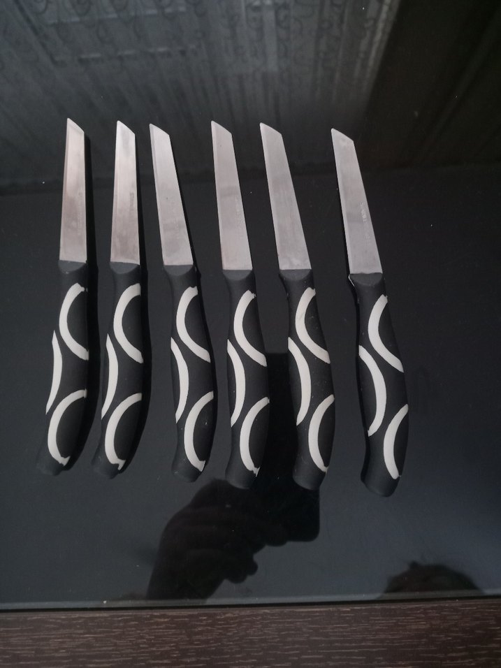 Altı adet, siyah saplı ve beyaz desenli mutfak bıçaklarından oluşan set. Düz keskin bıçakları çeşitli kesim işler için uygundur.