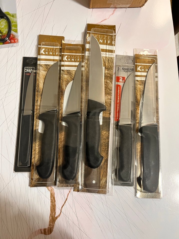 Farklı boyutlarda bıçaklardan oluşan, siyah saplı mutfak bıçak seti. Her bıçak ayrı ambalajda bulunur. Sürmene kurban bıçakları adet fiyatı