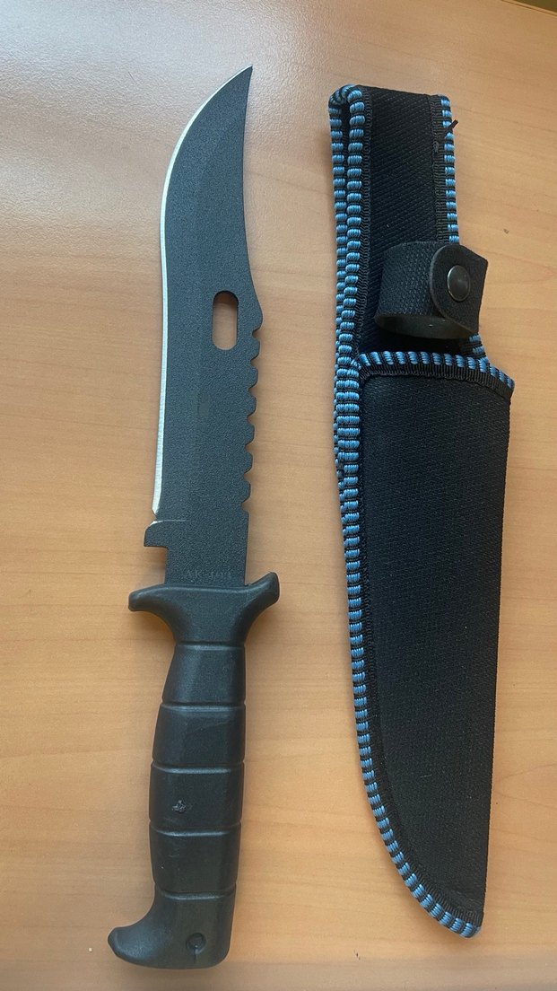 Siyah saplı, testere uçlu kamp bıçağı, mavi dikişli koruyucu kılıf ile birlikte gelir. Columbia marka