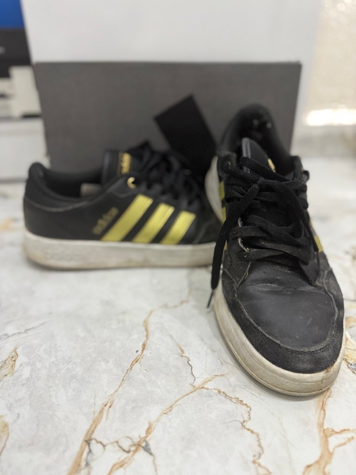 Siyah tabanlı, koyu sarı çizgili Adidas spor ayakkabılar, rahat ve şık günlük kullanım için uygundur.