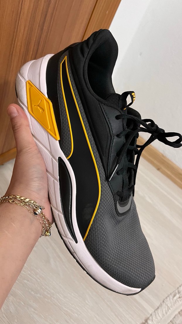 Bağcıklı, siyah ve sarı baskılı üst kısmı ve beyaz kauçuk tabanı ile spor ve sokak stilini birleştiren erkek ayakkabısı. Puma marka 45 bumara sayılı ve tertemiz kullanıldı kutusunu bulabilirsem kutusuyla göndereceğim
