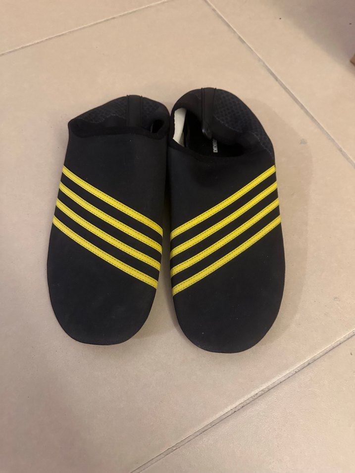 Siyah ve sarı renklerde, velcro kapamalı erkek deniz ayakkabısı.Kauçuk malzemeden yapılmıştır ve sokak modası için uygundur. 41 numara. Çok temiz.