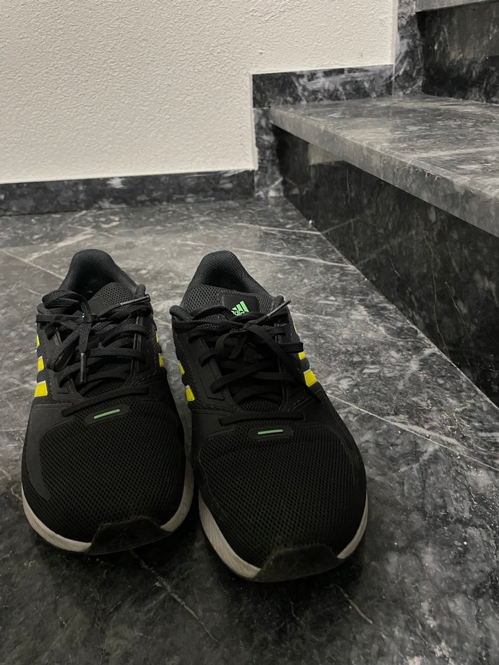 Siyah tabanlı, koyu sarı detaylı erkek spor ayakkabısı. Kauçuk taban ve cırt cırtlı kapanışa sahiptir. ♂️