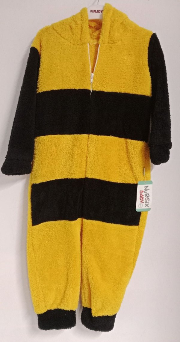Fermuarlı ön kısmı ve yumuşak, sıcak kumaşıyla koyu sarı ve siyah zebra desenli Welsoft kapşonlu bebek tulumu, sokak tarzında.boy 88cm en 36cm