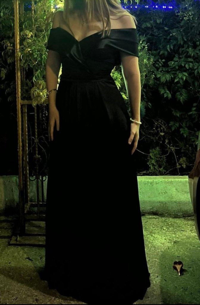Bu siyah uzun abiye elbise, straplez yakası, drapeli detayları ve ince askılarıyla klasik gotik şıklığı yansıtıyor. Düğün ve özel davetler için uygun. Bir gece giyildi.
