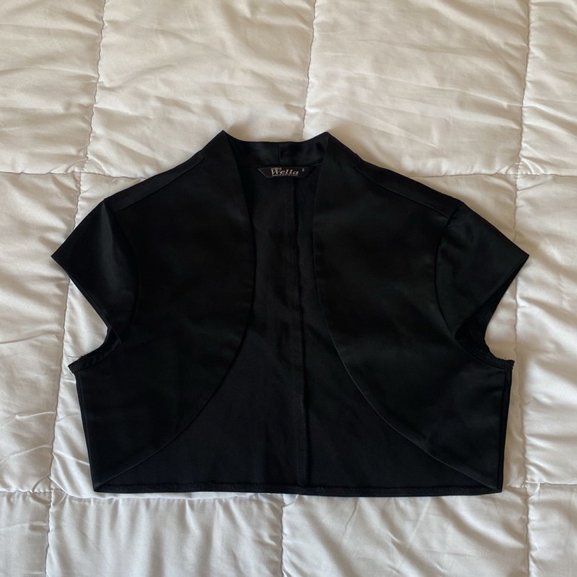 Saten tasarıma sahip siyah bolero. İpek gibi dokulu kumaştan, sade ve şık bir kez kullanıldı sorunsuz. Yetişkin olarak kullandım çocuklar içinde uygundur