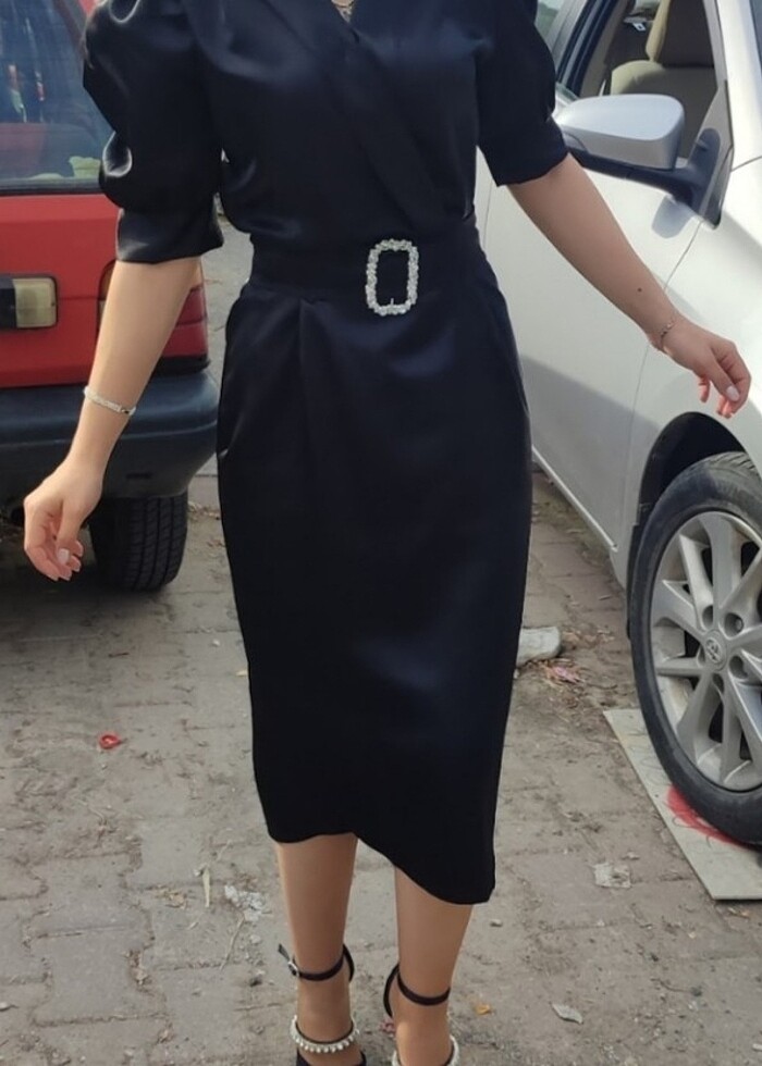 İki adet kuşağı bir adet kemeri vardır 34 beden arkasinda küçük yırtmacı bulunur hafif balon koldur Boy:108 cm