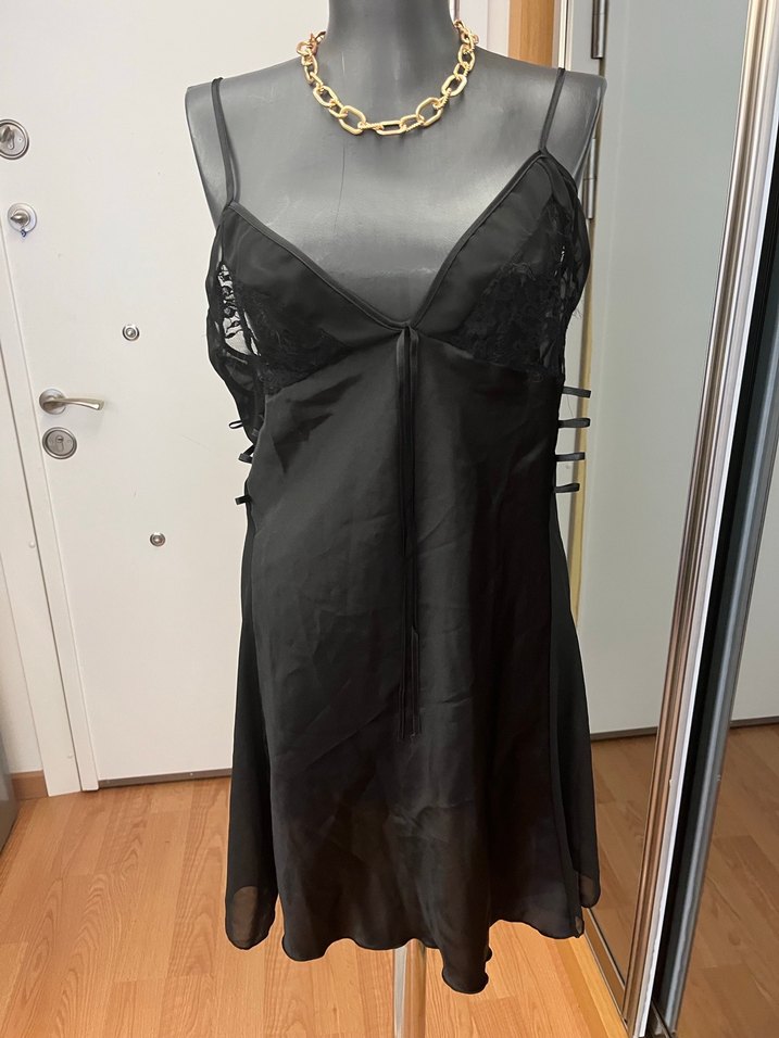 Siyah, nakışlı detaylara sahip, ince askılı ve vücuda oturan gotik tarzda midi gecelik. Normal boyda ve şık bir tasarıma sahiptir. Ürün kusurları görselde belirtilmiştir