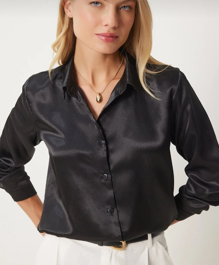 Saten dokulu, siyah uzun kollu kadın gömlek