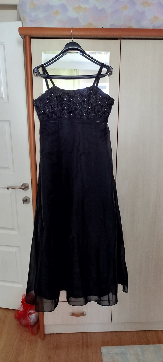 Askıları sökülebilir konumdadır. Üst tarafı gül detayları ve ışıltıları vardır ✨ Alt tarafı satendir. A kesim tarzı bir elbisedir. Sadece 2 kez giyildi. Deformesi yoktur. Midi bir elbisedir.