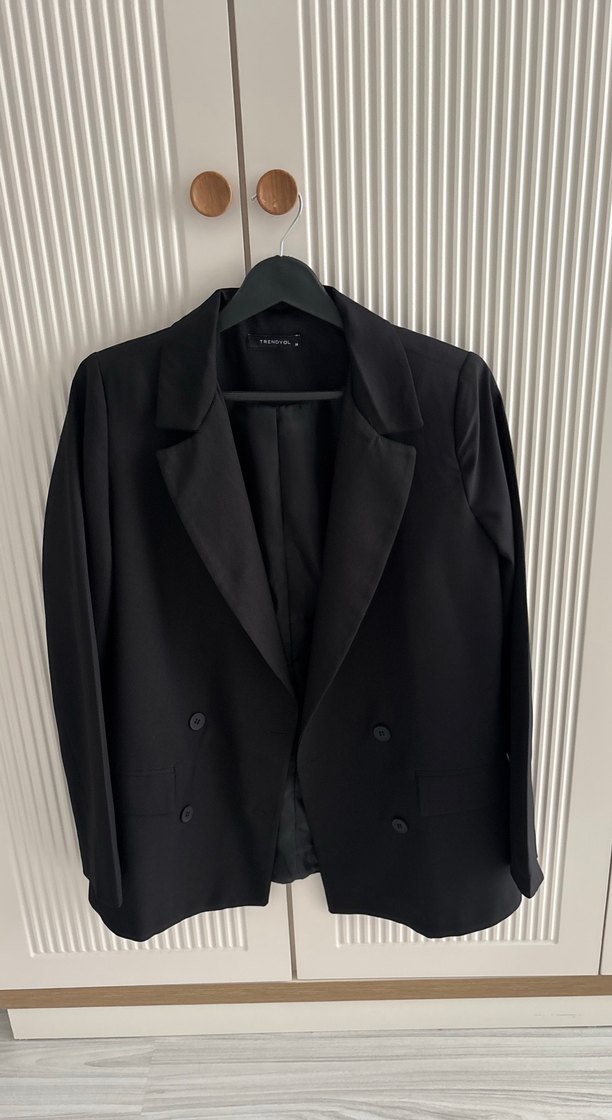 Siyah, saten dokulu blazer, klasik kesim ve yaka detayına sahiptir. Askılı kolları ve midi boyu ile ofis için şık ve rahat bir seçenektir. ✨kalıbı biraz dar 36 bedene de olur.