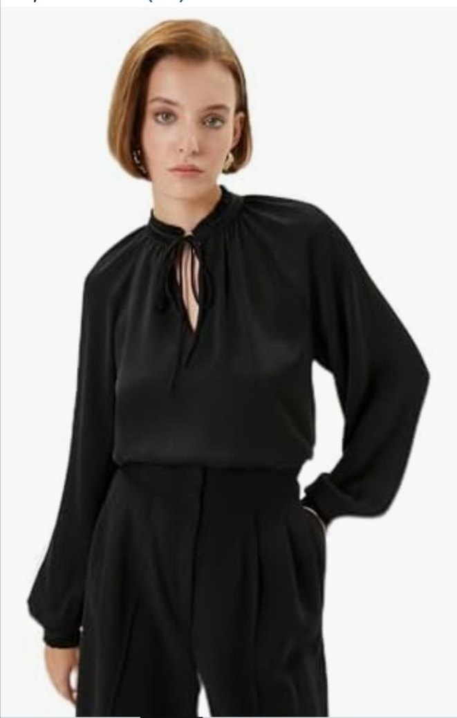 Siyah, bağlama detaylı ve uzun kollu bu bluz, kısa ve bol kesimdir. İpek gibi dokusuyla ofis için şık ve rahat bir görünüm sunar. ✨