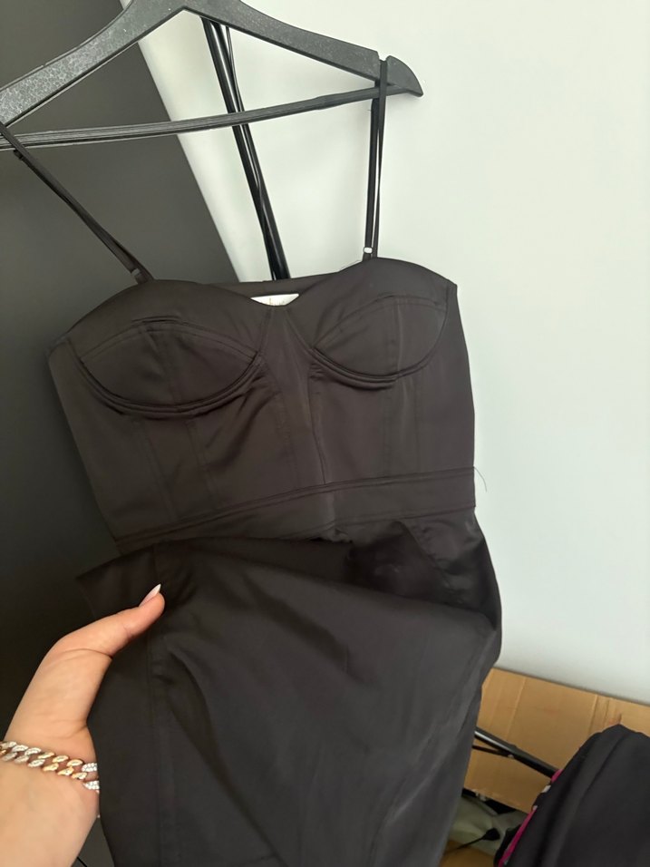 Siyah, straplez ve ince askılı, fermuarlı detaylı, vücuda oturan midi elbise. Minimalist sokak stili için uygun, günlük kullanıma ideal.
