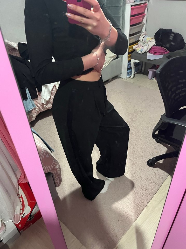 Siyah, saten dokulu, normal boy midi kesim ve rahat kesimiyle günlük sokak stiline uygun maternity pantolon.