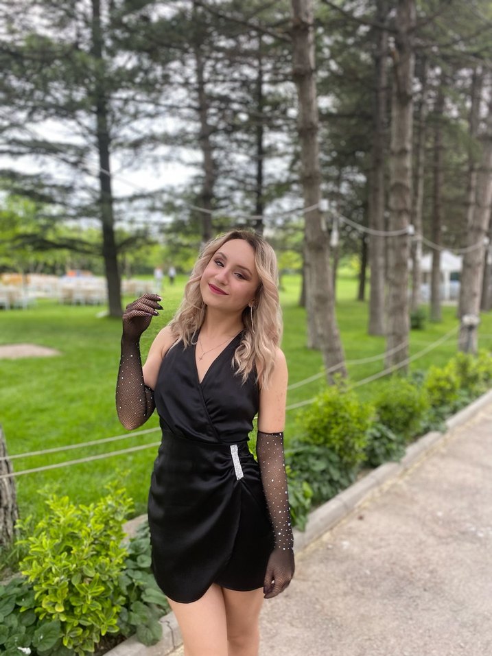 Mezuniyetimde giydim boyu mini boyundan bağlamalı bir model. Kumaşı saten taş detayları mevcut.