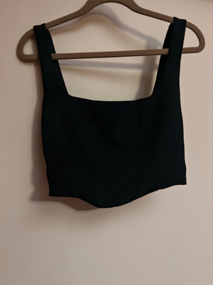 Saten kumaştan yapılmış, kolsuz ve kare yakalı siyah büstiyer. Vücuda oturan kesimiyle günlük kullanıma uygun şık bir sokak tarzı sunar.